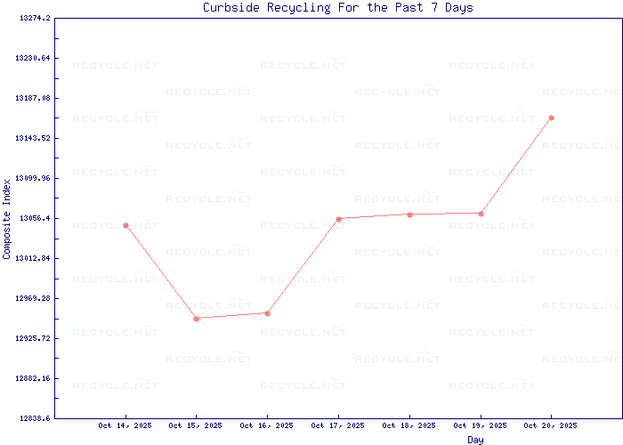 The Curbside Recycling Composite Index tracks the changing market prices of recyclable commodities collected from municipal curbside recycling programs . The Index consists of a weighted basket of specific benchmark grades of scrap curbside materials. The benchmarks include specific grades of scrap glass, paper, plastic and metal. The Index includes snapshots of 5 viewpoints of market trends : the past 7 days, past 30 days, past 90 days, past 1 year and past 2 years.